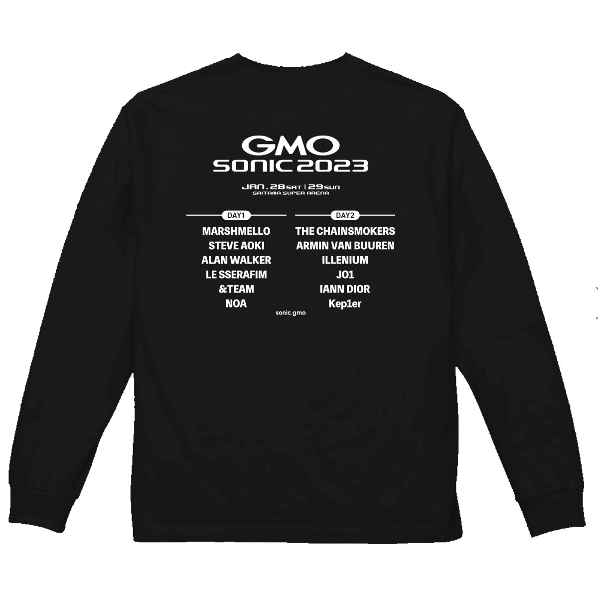 GMO SONIC チェーングラフィックがフロントにプリントされたロングTシャツ。 バックにはラインナップがプリントされています。